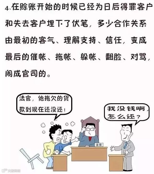 4 、在赊账开始的时候已经为日后得罪客户和失去客户埋下了伏笔,多少合作关系由最初的客气、理解支持、信任,变成最后的催帐、拖帐、躲帐、翻脸、对骂,闹成官司的。