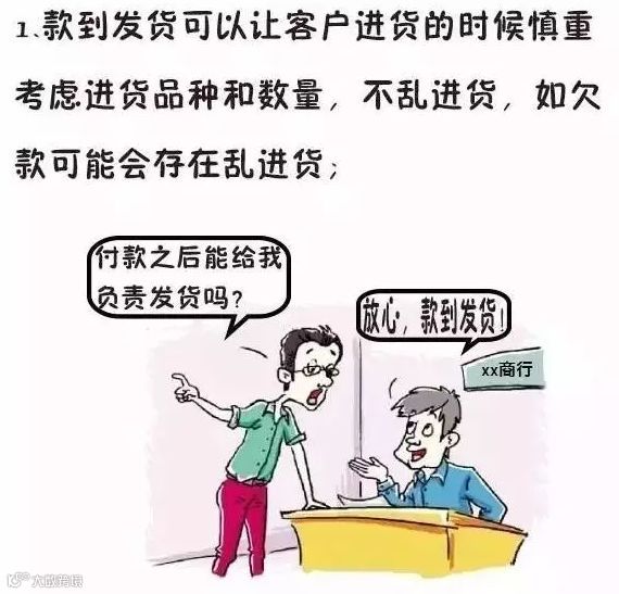 1 、款到发货可以让客户进货的时候慎重考虑进货品种和数量,不乱进货,如欠款可能会存在乱进货;