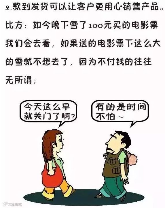 2、 款到发货可以让客户更用心销售产品。打个比方:如今晚下雪了100元买的电影票我们会去看,如果送的电影票下这么大的雪就不想去了,因为不付钱的往往无所谓;