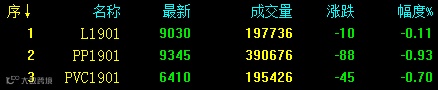 上冲无力,塑料相关品种期货盘中试探走高后集体走弱。目前塑料各品种期货逐步移仓换月,且受制于基本面孱弱,以及对未来的向好预期,近期塑料相关期货整体呈现近弱远强格局。具体来看:L1901收9030跌10或0.11%;PP1901收9345跌88或0.93%;V1901收6410跌45或0.70%。