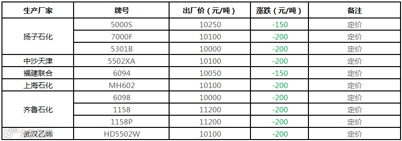 中石化华东HDPE部分定价下调150-200元/吨!!!