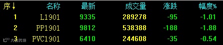 难有支撑,塑料相关品种期货继续探底,其中PP1901减仓跌破万元关口后加速下行。具体来看:L1901收9335跌95或1.01%;PP1901收9812跌188或1.88%;V1901收6410跌35或0.54%。