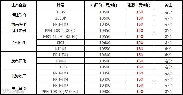 中化泉州炼厂PP价格上涨50元/吨:其中L5E89报价在10500元/吨福建送到,L5E89-GD暂停报价,L5D98暂停报价,H5250R暂停报价,LH7714-12暂停报价,H5380R-1暂停报价吨。此外,潮汕地区送到需加50元/吨运费。