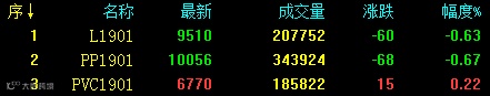 多头获利平仓,聚烯烃相关品种期货减仓下跌,PVC仍维持震荡小涨趋势。具体来看:塑料1901收9510跌60跌幅0.63%;V1901收6770涨15涨幅0.22%;PP1901收10056跌68跌幅0.67%。