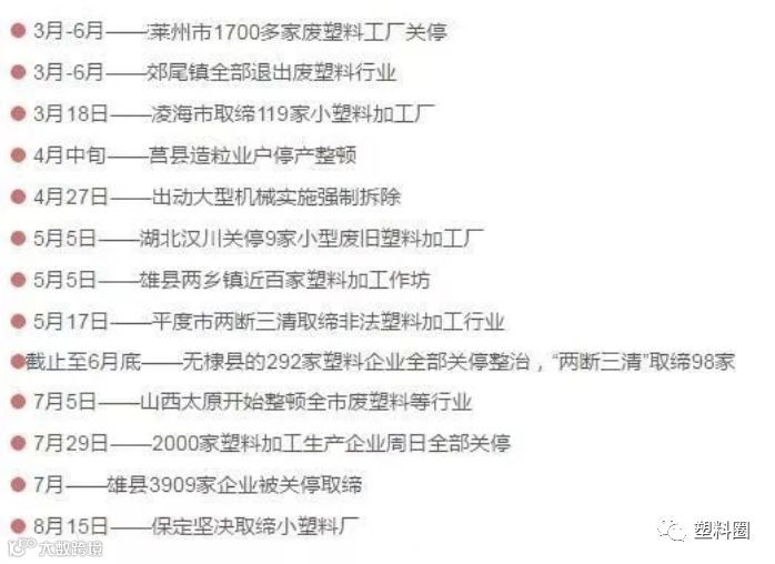 2018年中国方面,“禁废令”进一步升级,继2017年底禁止进口生活源废塑料后,工业来源废塑料2018年12月31日全面禁止!随着国家环保整顿的推进,各地再生塑料厂家都受到了不同程度的影响,更多的小型工厂,家庭作坊被关停、问责,大型厂家也被要求限产,停产整顿。