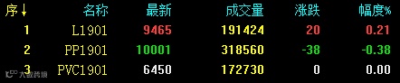 受昨日夜间利空消息影响,塑料相关品种期货今日全线低开震荡,减仓收阳K线。目前具体来看:L1901收9465涨20或0.21%;PP1901收10001跌38或0.38%;V1901收6450稳。