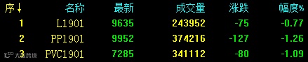 今日塑料相关品种期货全线下挫,PP1901合约减仓下行跌破万元关口。具体来看:塑料1901收9635跌75跌幅0.77%;V1901收7285跌80,跌幅1.09%;PP1901收9952跌127,跌幅1.26%。