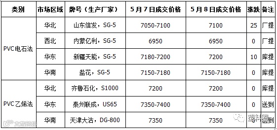 国内PVC市场报价延续高位整理。V1909期货小幅低开,随后盘面下跌至5日线附近,尾盘稍有收复,放量减仓收上下影小阴线。PVC企业来看,各地区企业除部分仍有补涨表现外,多数维持稳定报价,另外部分企业因厂区欠单较多,暂时主发订单,山东一带多家企业封盘不报。现货市场来看,各主销区市场多维持高价报盘,暂无明显变化。各主销区商家观望心态浓厚,出货随行就市,成交重心稳定。下游制品企业来看,对期货下跌抱有一定预期,部分观望等待,刚需者则小单补库维持消耗,等待价格适度回调。当前电石法5型主流价格参考7060-7320元/吨,乙烯料主流参考7100-7350元/吨上下,高型号货源价格高100-150元/吨。