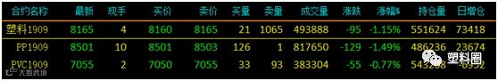 今天又是空头完虐多头的一天,夜盘三大品种相关期货已表现颓势,各品种均以飘绿告终。日盘塑料及PP主力合约空头继续大幅增仓,打压盘面,其中L1909日增仓高达73418手。具体来看:L1909收8165跌95或1.15%;PP1909收8501跌129或1.49%;V1909收7055跌55或0.77%。