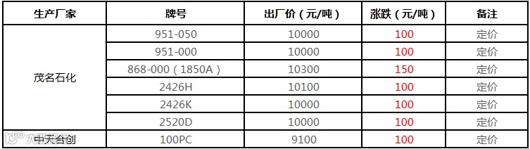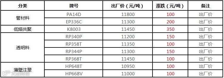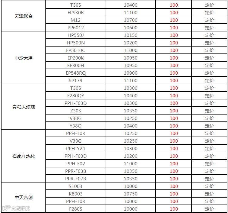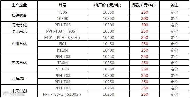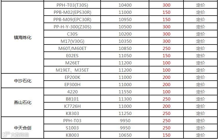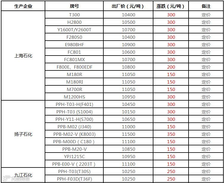 中化泉州炼厂PP价格上涨200元/吨:其中L5E89报价在10450元/吨福建送到,L5E89-GD暂停报价,L5D98暂停报价,H5250R暂停报价,LH7714-12暂停报价,H5380R-1暂停报价吨。此外,潮汕地区送到需加50元/吨运费。