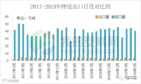 据海关数据统计, 2019年5月聚丙烯进口40.27万吨,环比减少8.66%,同比减少4.57%。今年累计进口204.57万吨。2019年5月聚丙烯出口3.537万吨,环比减少32.97%,同比增加6.92%。今年累计出口15.154万吨。