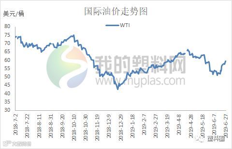 六月油价整体呈现先低位盘整然后连续暴涨行情。在前期因中美贸易谈判破裂,美原油一度逼近50美元/桶。但随着伊朗局势的发酵,特别是伊朗击落一架美国无人侦察机之后,两者一度处于战争边缘,加之G20峰会期间中美将会重启谈判,油市从低位连续暴涨反弹。此外,美国原油进入去库存阶段,且成品油库存多次下降,同样支撑油价走高。本月聚乙烯市场价格走势与原油大体一致,整体先跌后涨,前期期货走软,石化库存高企,销售压力较大,部分降价销售;随后受期货及石化拉涨,市场交投向好,现货价格受提振小涨,刺激下游需求,石化降库明显。