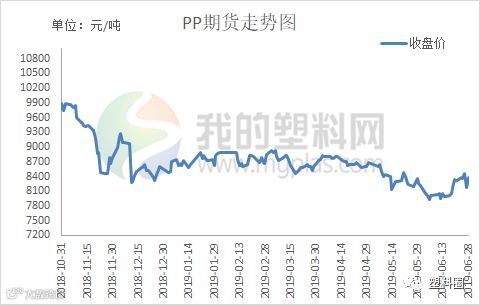 本月国内PP主力1909合约震荡上涨。具体来看,月初开盘价在8150元/吨,6月28日收盘8387元/吨,最高8514元/吨,最低7811元/吨,月涨172元/吨或2.09%。成交量增加至1584万手,持仓量58.4万手。技术面来看,PP1909合约低开震荡整理,减仓收小阳线,盘面资金流出0.16亿元。MACD(12,26,9) 指标中红色能量柱变短,DIFF处于0轴上方,DEA处于0轴下方,能量喇叭口开口向上。KDJ指标在超买区形成死叉,价格支撑减弱。压力位8500附近,支撑位8100附近。