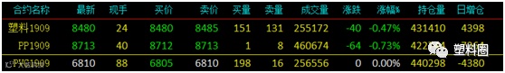 具体来看:L1909收8480跌40或0.47%;PP1909收8713跌64或0.73%;V1909收6810稳。