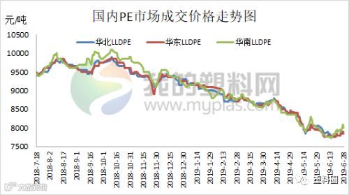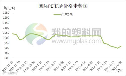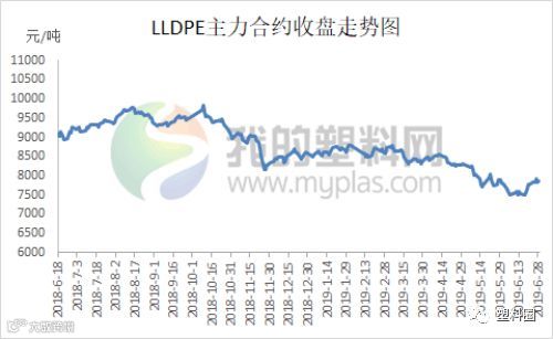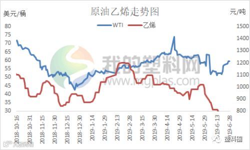 6月油价整体呈现先低位盘整然后连续暴涨行情。在前期因中美贸易谈判破裂,美原油一度逼近50美元/桶。但随着伊朗局势的发酵,特别是伊朗击落一架美国无人侦察机之后,两者一度处于战争边缘,加之G20峰会期间中美将会重启谈判,油市从低位连续暴涨反弹。此外,美国原油进入去库存阶段,且成品油库存多次下降,同样支撑油价走高。本月聚乙烯市场价格走势与原油大体一致,整体先跌后涨,前期期货走软,石化库存高企,销售压力较大,部分降价销售;随后受期货及石化拉涨,市场交投向好,现货价格受提振小涨,刺激下游需求,石化降库明显。