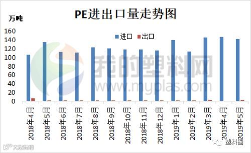 2019年5月份PE进口量141.91万吨左右。其中LLDPE进口量为43.43万吨;HDPE进口量为67.51万吨;LDPE进口量为30.97万吨。2019年5月份PE出口总量2.53万吨。
