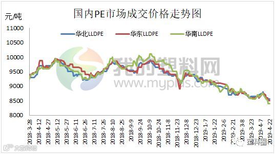 由上图可以看出2019年以来,国内PE现货市场价格呈现震荡走软趋势。前期行情下跌的主要原因在于,线性期货市场整体弱势,挫伤市场交投气氛,加之部分石化频繁下调出厂价,现货市场整体气氛偏空,而随着3月份地膜旺季到来,原料市场跌势逐渐放缓,至3月下旬,华东LLDPE主流价格在8600-8650元/吨左右;华东LDPE主流价格在8900-8950元/吨左右。4月初随着伊朗KORDESTAN乙烯管道爆炸及洪水等原因的影响,进口供应有所减少,众多利好下线性期货一度反弹,中石化华北、中石化华东、中石化华南及中油华北、华东、华南各大区,借机开始连续调涨LLDPE、LDPE及HDPE出厂价格,各地煤化工企业、地方及合资企业出厂价格跟涨明显,顿时市场炒作声音一片,截止至4月10日,华东LLDPE主流价格涨至8750-8800元/吨,华东LDPE主流价格涨至9050-9100元/吨左右。