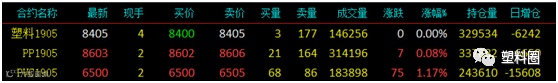 主力合约逐步移仓换月,塑料相关品种期货稳步上涨,其中V1905受现货基本面提振,期价继续大幅上行。具体来看:L1905收8405稳;PP1905收8603涨7或0.08%;V1905收6500涨75或1.17%。