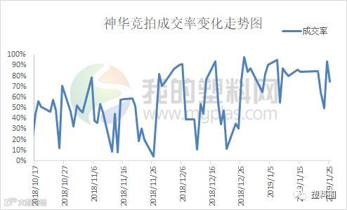 上周国内神华系列PP竞拍平均成交率在73.53%,较去年同期85.77%下滑12.24%。其中成交率峰值出现在1月24日,成交率上升至93.7%,主因前一交易日神华竞拍成交率下降至50%以下,当天竞拍底价部分明显下调,造成低价竞拍货源增多,部分下游工厂及中间商参与竞拍,市场踊跃度提高。