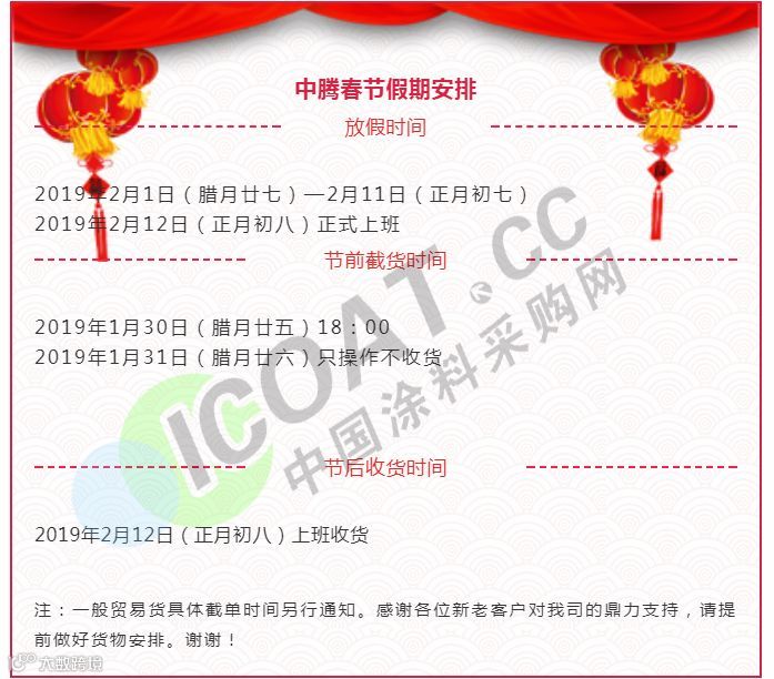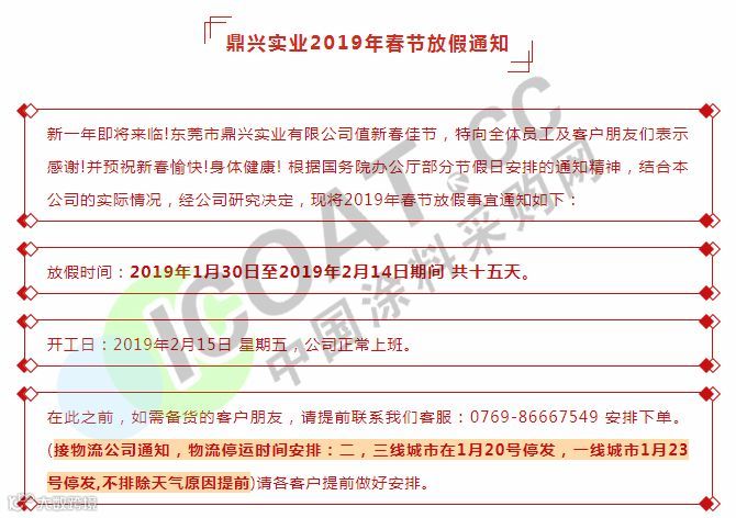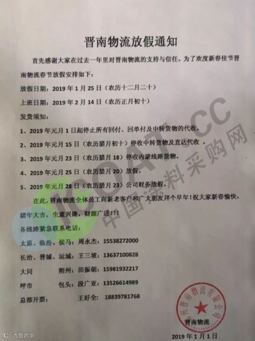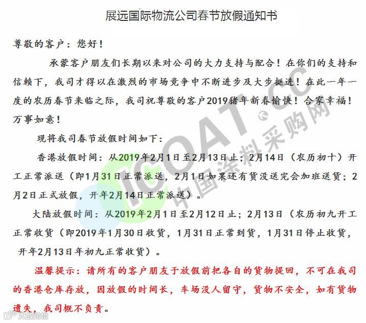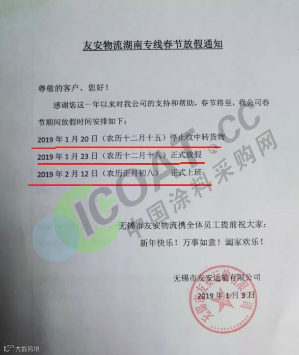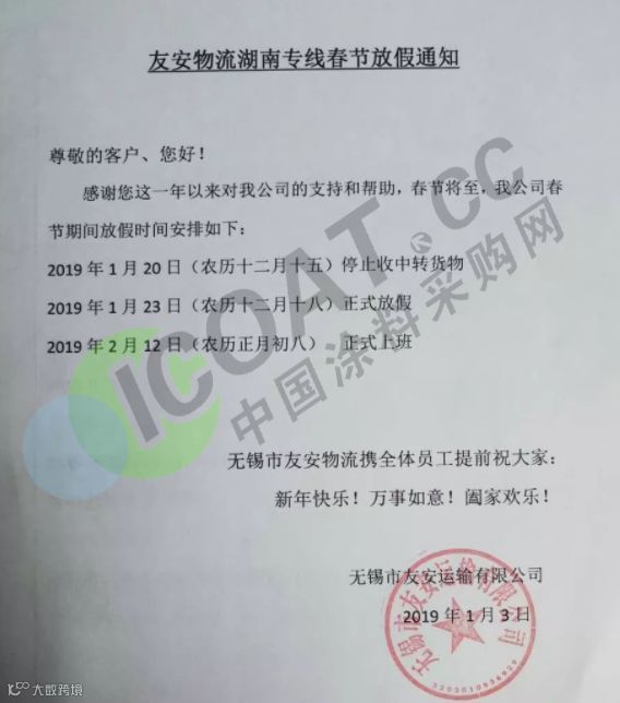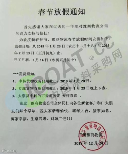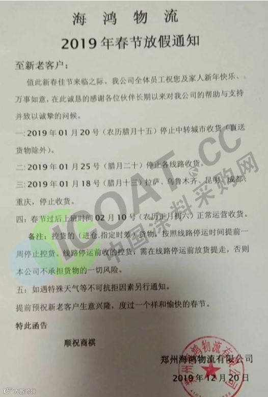 年关将近,很多塑料企业及物流公司都陆续发布了2019年春节放假通知。据小编了解,大部分物流公司从1月20日起开始放假,节后2月12日左右开始正常运输,2019年春节放假时间较2018年春节放假时间有所提前。部分物流停运与塑料企业放假通知如下: