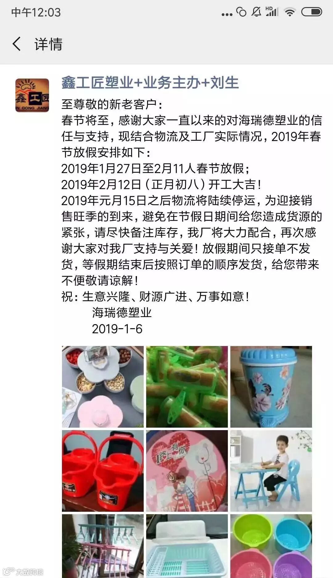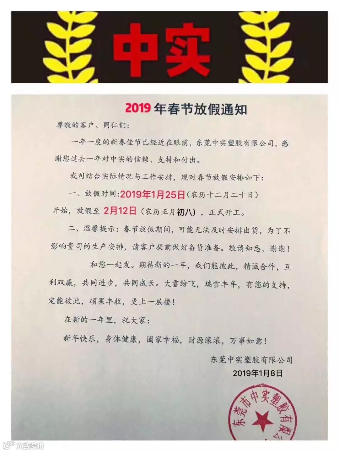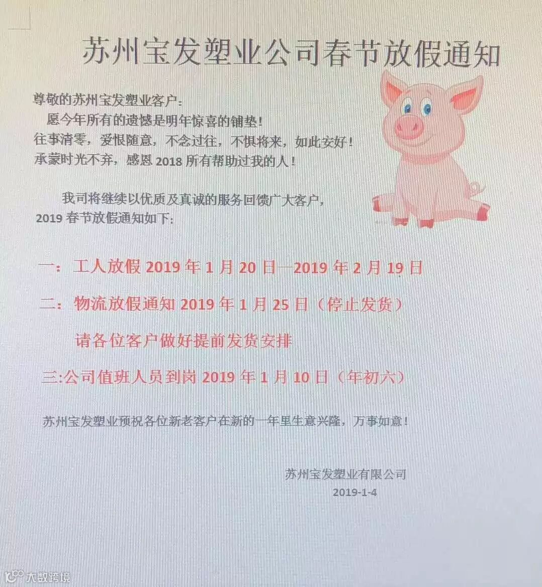 年关将近,很多塑料企业及物流公司都陆续发布了2019年春节放假通知。据小编了解,大部分物流公司从1月20日起开始放假,节后2月12日左右开始正常运输,2019年春节放假时间较2018年春节放假时间有所提前。部分物流停运与塑料企业放假通知如下: