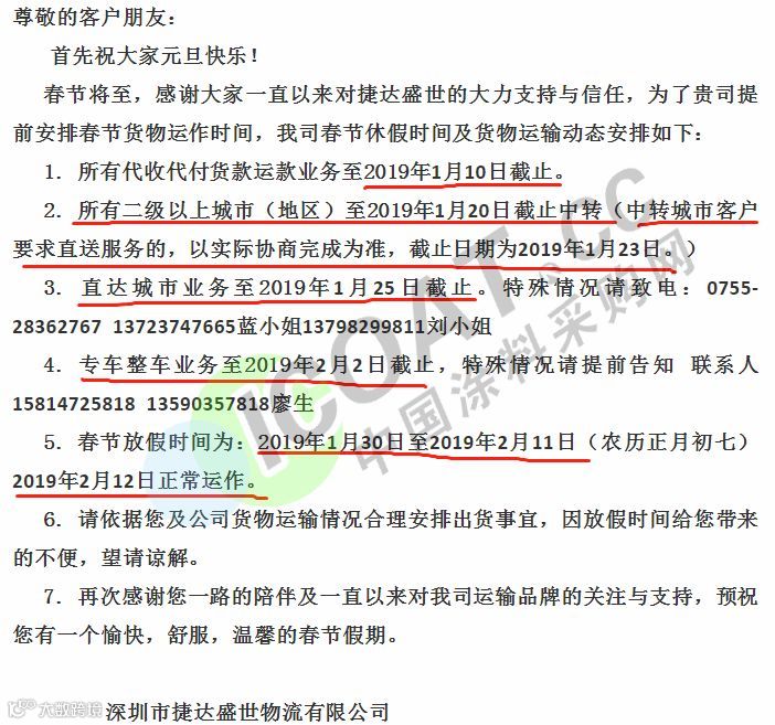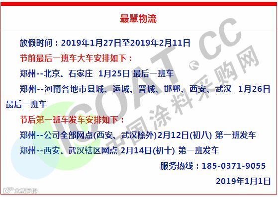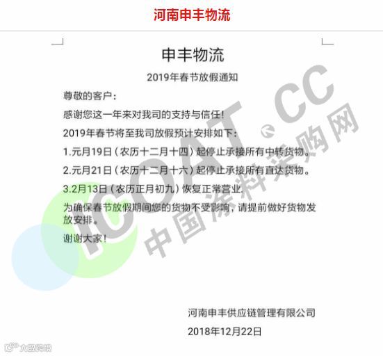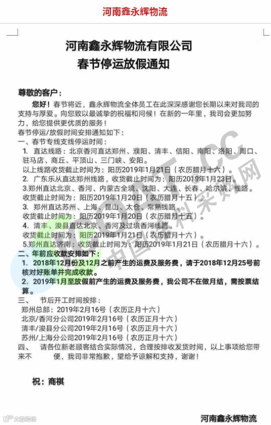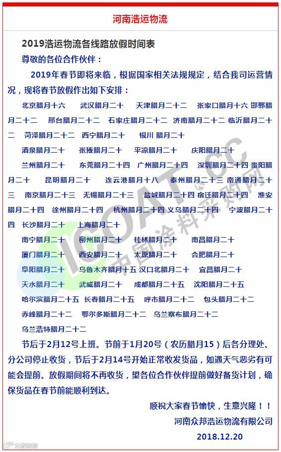 放假备注:江西省内各线截止收货日期2019年1月30日 山东省,河南省,河北省各线截止收货日期2019年1月26日