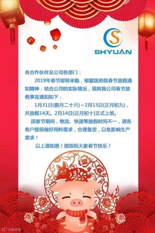 正值中国的传统节日“春节”来临,在此向各位新老客户和广大朋友们拜个早年!预祝大家新春愉快!财源广进!事业红火!