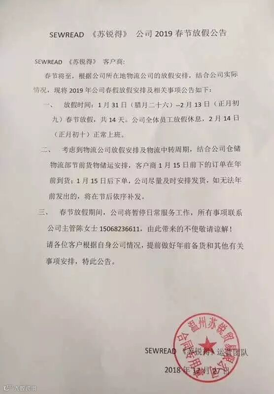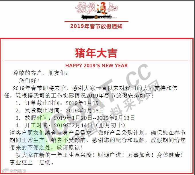放假备注:截止收货时间2019年1月18日最后一天收货,2月14日上班,预祝大家新年快乐生意兴隆!