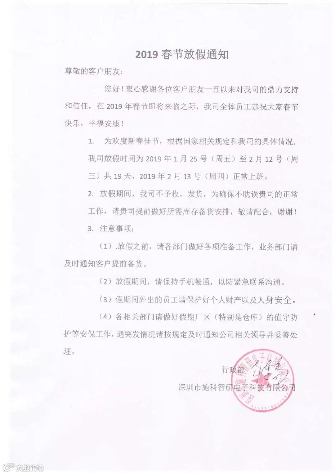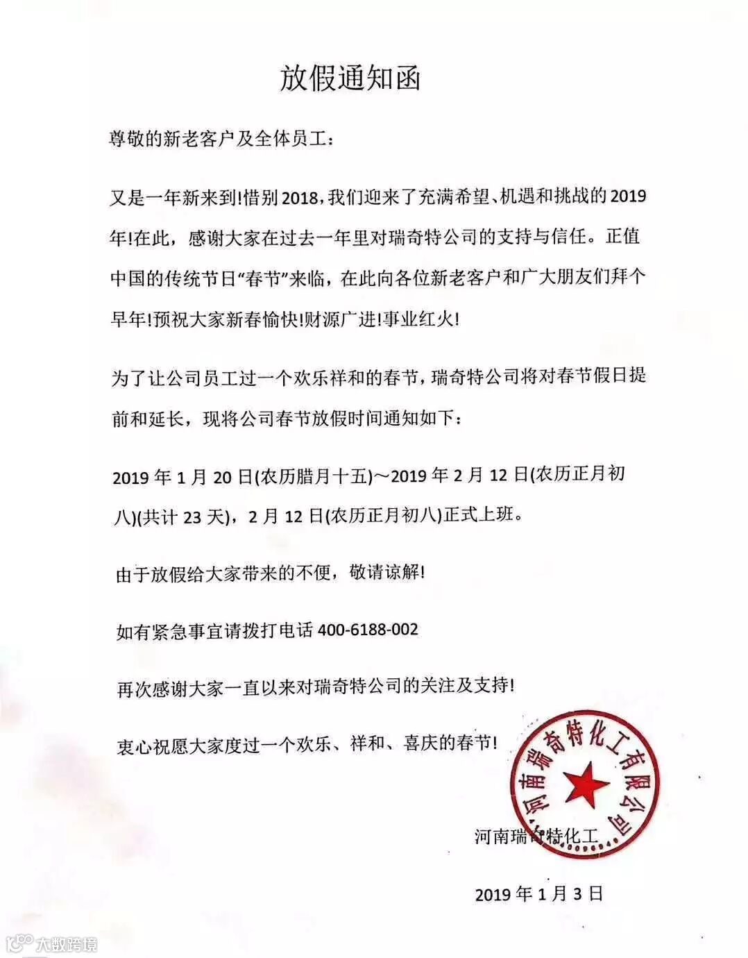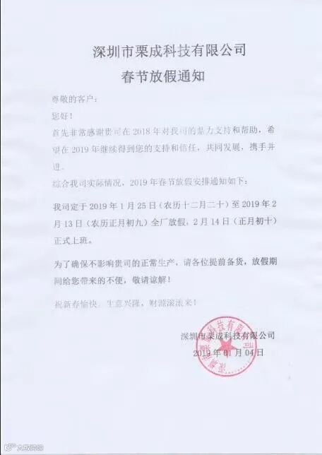 放假备注:放假时间,农历十二月十八日。开工时间2019年正月初十
