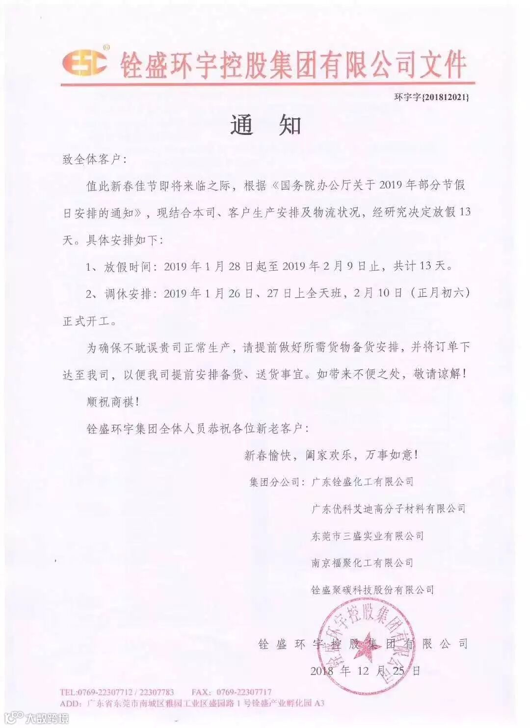 尊敬的新老客户及全体员工: