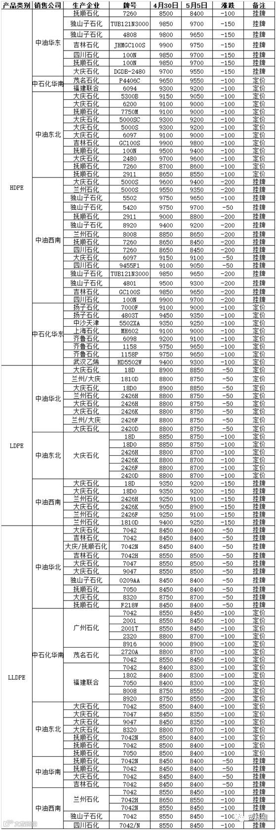 假期归来,聚烯烃石化库存再度突破百万吨大关至102万吨左右,较节前4月30日上涨14.5万吨,涨幅在16.57%。而持续下跌的行情导致合同户开单积极性降至低位,石化库存和销售压力继续增强。今日PE多数石化企业下调出厂价格,降幅最高达200元/吨。具体调价信息请看以下详表: