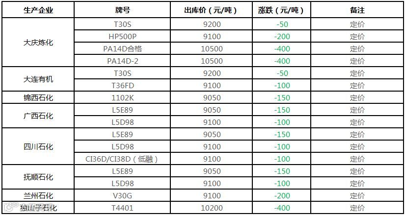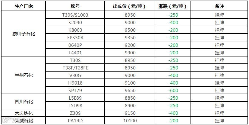 中油华南PP挂牌该定价部分下调50-400元/吨!!!