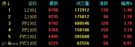 塑料相关品种期货超跌反弹,其中PP近月合约成为上涨排头兵。多头增仓上涨,KDJ/MACD等指标拐头向上,短期8305点筑底成功,期价有望震荡偏强运行。塑料及PVC近月合约也有不同程度反弹。近期主力移仓换月,三大品种近月合约走势均相对强于远月。具体来看:L1901收8700涨120或1.40%;L1905收8295涨90或1.10%;PP1901收8782涨320或3.78%;PP1905收8368涨259或3.19%;V1901收6445涨65或1.02%;V1905收6225涨50或0.81%。