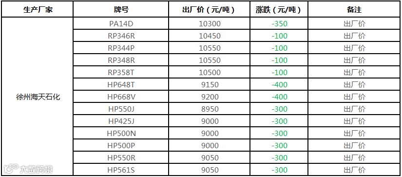 徐州海天石化PP出厂价格下调100-400元/吨