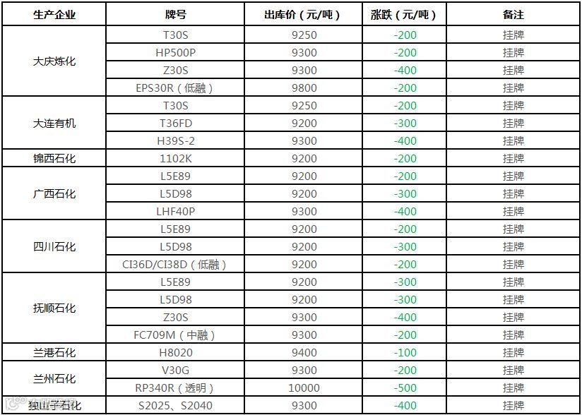 中油华南PP挂牌价格下调100-500元/吨!!!