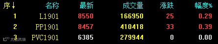 塑料相关品种期货走势分化,其中L1901和PP1901高位运行,V1901高开后收平。具体来看:L1901收8550涨25或0.29%;PP1901收8457涨33或0.39%;V1901收6385平0或0.00%。