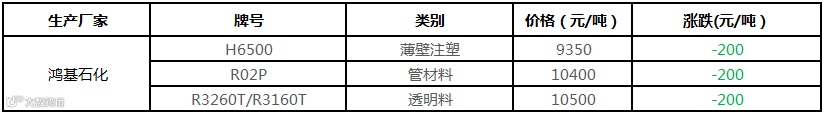 鸿基石化PP价格下调200元/吨