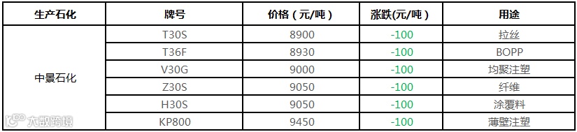 中景石化PP价格下调100元/吨