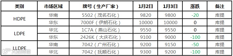 尽管市场对于减产落实的信心增强,隔夜国际油价盘中跌后暴力拉升,但对于市场提振作用不大。节后石化去库存速度明显放缓,各大区销售压力有所增强,石化出厂价格跌多涨少,场内货源成本支撑松动。且期货回跌打压买盘入市积极性,商家积极出货,市场各品种价格多数走低50-100元/吨不等。下游需求跟进疲软,场内交投气氛表现清淡,塑料多数品种整体成交难度较前期明显加大。对于后市,业者心态谨慎,持货商年前积极减仓出货为主。
