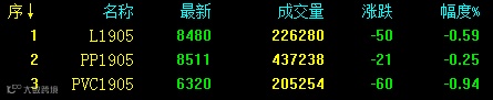 今日国内商品期货多数收涨,原油、焦炭收涨2.8%,螺纹、沪银、郑醇、线材、橡胶、焦煤、沪镍、热卷、沥青、PTA、铁矿、菜粕、锰硅、硅铁、玻璃等涨逾1%。但塑料相关品种期货未能同步走强,各品种延续昨日下跌趋势,今日继续回调。具体来看:L1905收8480跌50或0.59%;PP1905收8511跌21或0.25%;V1905收6320跌60或0.94%。