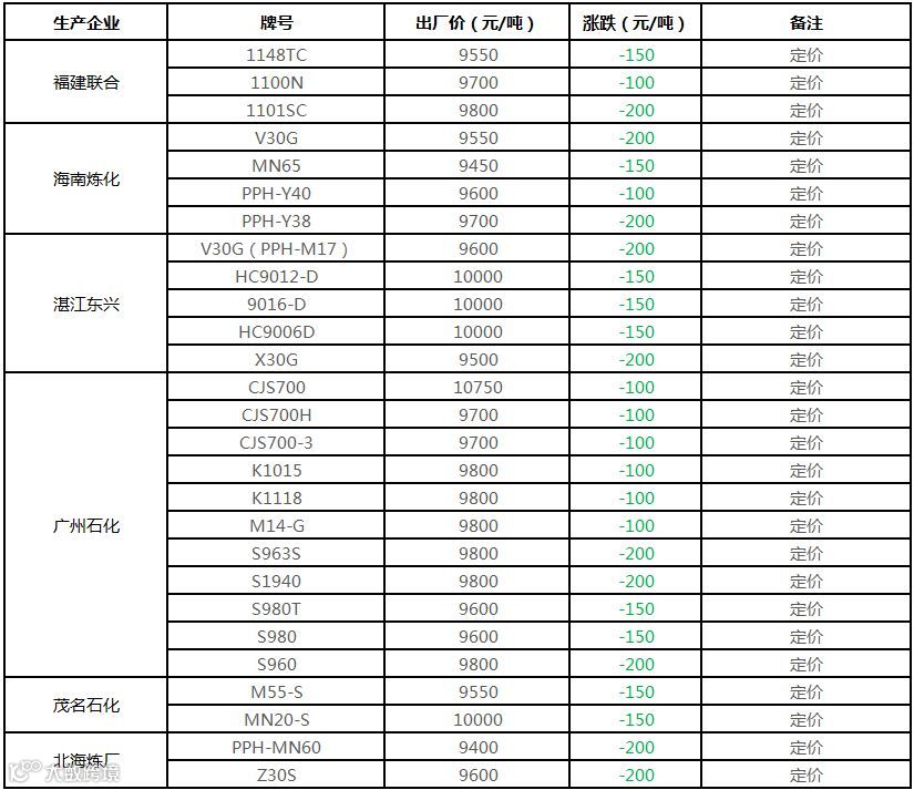 中油华南PP挂牌价格部分下调150-300元/吨!!!