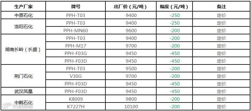 中石化华中PP部分定价下调200-450元/吨!!!