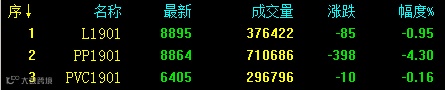 延续夜盘跌势,原油、甲醇期货开盘跌停。早间PTA、焦炭、螺纹跌超4%,橡胶跌超3%,铁矿、硅铁、锰硅、沪锌跌超2%。塑料相关期货品种全线跳空低开,其中L及V1901合约相对表现稍强,低开后盘中震荡上行,日内减仓收长下影阳K线。PP主力合约积弱难改,低开后继续探底,资金流出6891万,日跌幅高达4.30%,位居商品跌幅榜第三位。具体来看:L1901收8895跌85或0.95%;PP1901收8864跌398或4.20%;V1901收6405跌10或0.16%。
