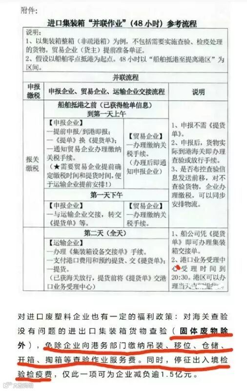 对海关查验没有问题的进出口集装箱货物查验(固体废物除外),免除查验费,停征入境检验检疫费!仅检验检疫费这一项,就可为进口废塑料企业减负逾1.5亿元!