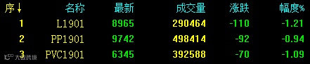 本月第一个交易日,塑料相关品种期货全线收跌:塑料1901合约连破支撑,增仓收取6连阴;PP及PVC主力合约盘中也分别创近期新低。具体来看:L1901收8965跌110或1.21%;PP1901收9742跌92或0.94%;V1901收6345跌70或1.09%。