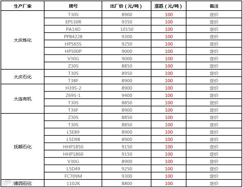 今日厂家聚丙烯产品定价上涨100元/吨:T30S定价在8750/吨,Z30S定价8800元/吨,H30S定价8800元/吨。