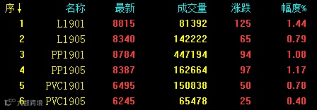 今日国内塑料相关品种期货延续前期反弹态势,截止尾盘三大品种近远月合约全线收涨。技术面来看,短线前期底部基本确认,但主力合约方面受上方均线压制仍较为明显。且中长期来看现货基本面未有明显改观,后期不宜过分追涨。具体来看:L1901收8815涨125或1.44%;L1905收8340涨65或0.79%;PP1901收8784涨94或1.08%;PP1905收8387涨97或1.17%;V1901收6495涨50或0.78%;V1905收6245涨25或0.40%。