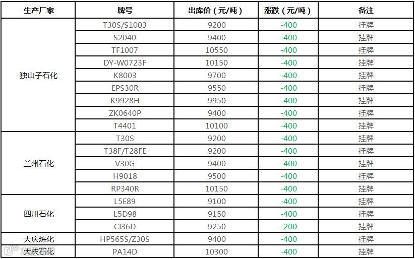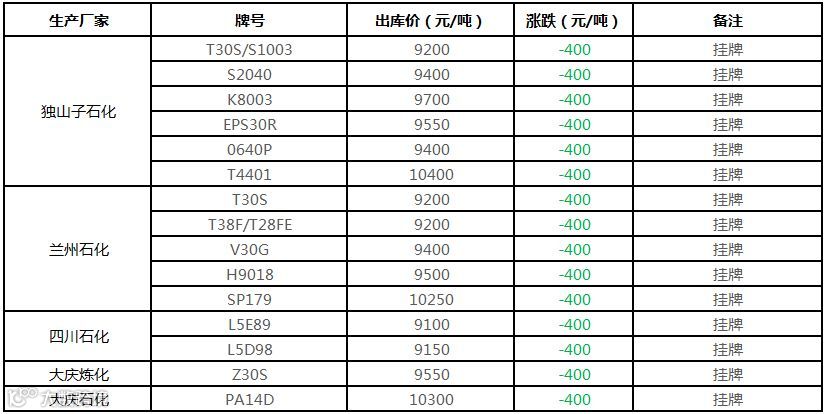 中油西南PP挂牌价格下调400元/吨!!!