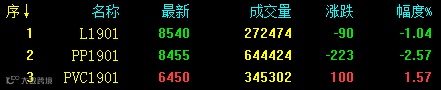 塑料相关品种期货走势分化,其中L1901和PP1901低开后震荡收跌,V1901震荡翻红,居涨幅榜第三。具体来看:L1901收8540跌90或1.04%;PP1901收8455跌223或2.57%;V1901收6450涨100或1.57%。