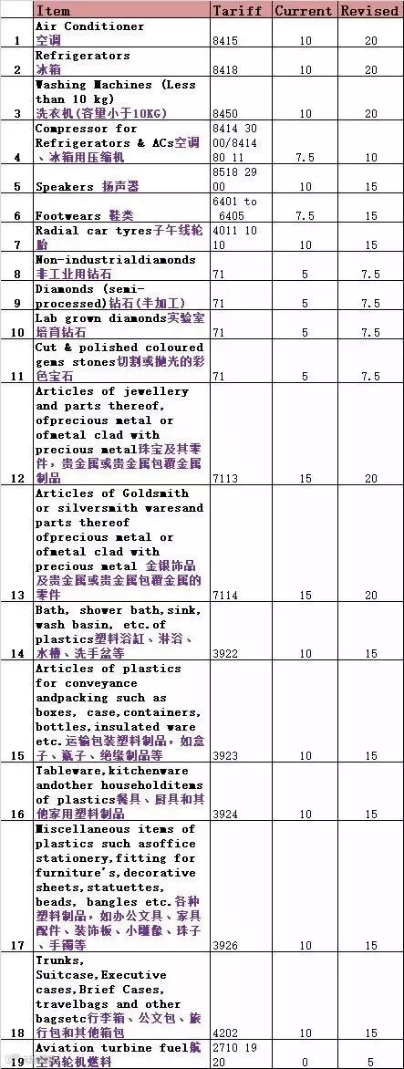 其中,航空燃油关税税率从零提升到5%,对航空公司造成一定打击;钻石及其他用于珠宝制造的宝石税率由5%上调至7.5%;进口空调、冰箱和小型洗衣机进口税率从10%翻倍至20%,价格必将更为昂贵。轮胎、扬声器、鞋履、旅行箱、旅行袋以及大量塑料制造的餐具和厨房用品均将面临更高关税。具体如下: